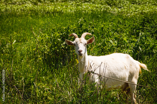 Obraz premium Goat grazing on green meadow and looking at camera at you