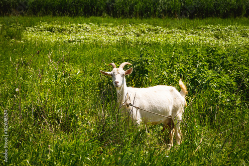 Obraz premium Goat grazing on green meadow and looking curiously at camera at you