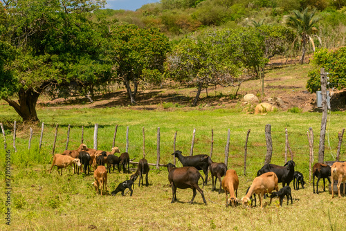 Naklejka premium Goat Herd Grazing in Rural Landscape, Matureia, Paraíba, Brazil on December...