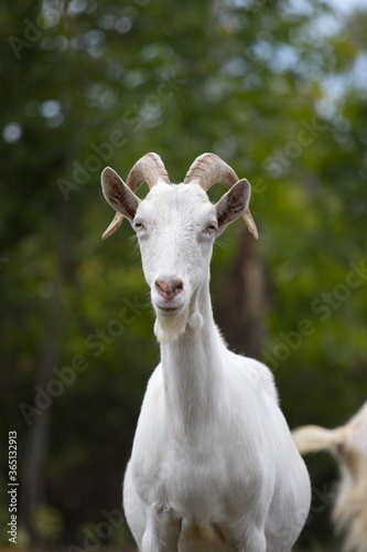 Fototapeta premium Goat in nature. Portrait of a white goat on a blurred background.