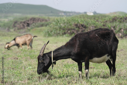 © Kit Leong, Naklejka premium Goat standing on a glass field at Penghu