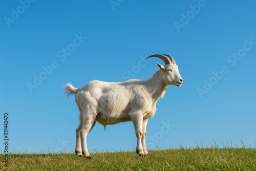 © haiqiang, Obraz premium goat standing on a grassy hill with a blue sky in the background