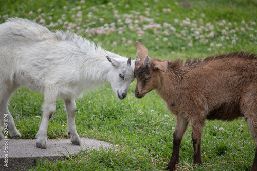 Fototapeta premium Goats butt on a green meadow with stone