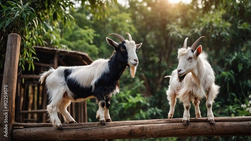 Obraz premium goats climbing on wooden structure background farm concept backdrop