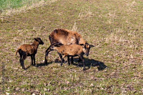 Fototapeta premium Goats grazing in a grass field on a farm.