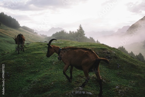 © Wirestock, Naklejka premium Goats grazing on a misty hillside