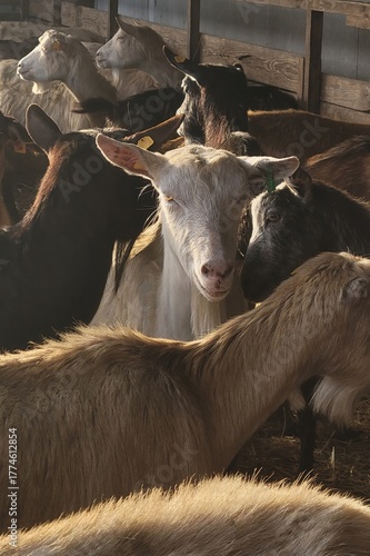 © enotmutant, Fototapeta premium Goats illuminated by sunlight in barn