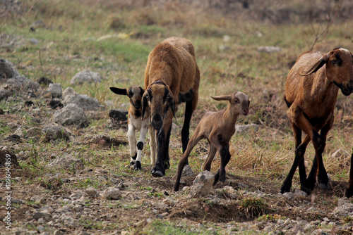 © Apple Stock 963, Fototapeta premium goats on road beside farm land