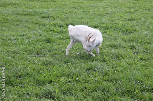 © Mikalai Drazdou, Obraz premium goats on village grass feeding