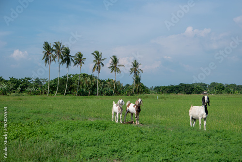 © Cloudyew, Obraz premium Goats walk. Background is paddy field