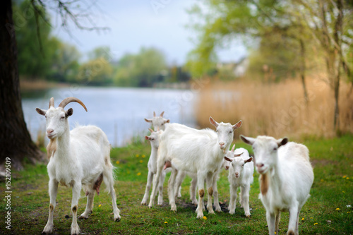 Obraz premium goats who are grazed on a meadow near the river