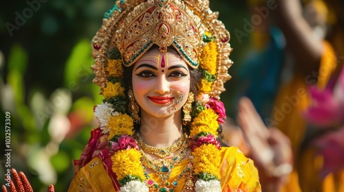 © Ganesha88, Fototapeta premium Goddess Laxmi portrait LAKSHMI Beautiful Hindu goddess with golden lotus and colorful flower garlands, holy face with happy smile, wearing yellow dress with red border on chest, full body with detaile