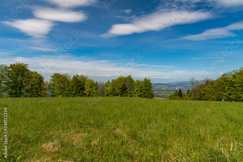 Obraz premium Godula hill in Moravskoslezske Beskydy mountains in Czech republic with meadow and trees around