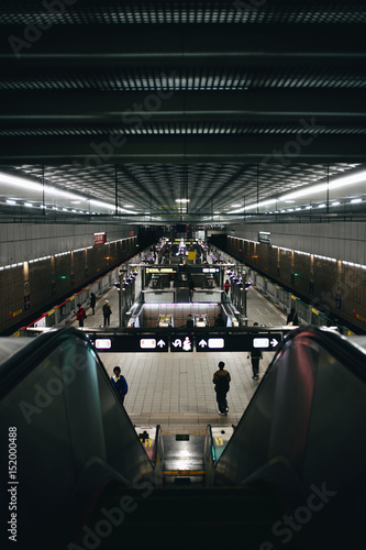 © Misa Matsuda, Fototapeta premium Going down the escalator of a subway station Taipei with silhouettes of people