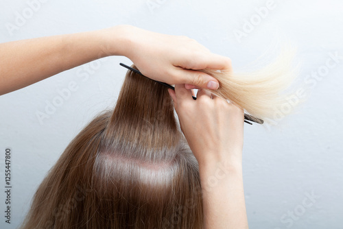Naklejka premium Going gray in young woman shows her gray hair, hair roots getting grey....