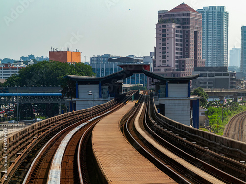 © Ankor light, Naklejka premium Going to work by train under a bright sunny sunrise with the cityscape and building at the horizon