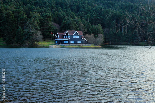 Fototapeta premium Golcuk nature park and a wooden lake house on the shore. Bolu, Turkey