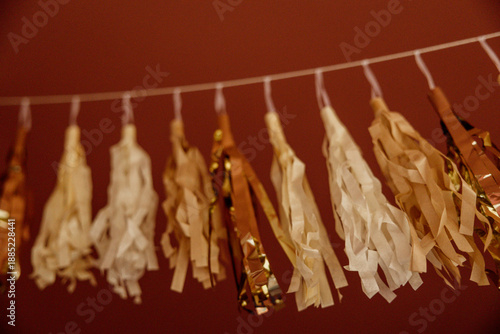 © Cavan, Fototapeta premium Gold and cream tassel garland hanging against a red wall.