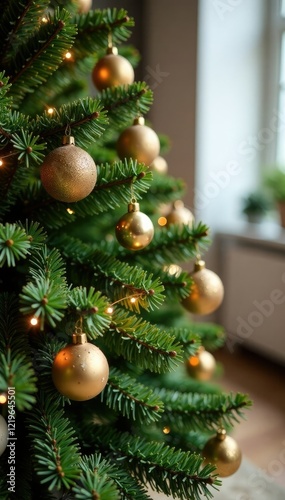 Fototapeta premium Gold and olive green garland wrapped around a wooden Christmas tree, winter...