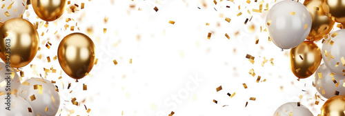 Fototapeta premium Gold and white balloons floating with falling confetti on white background
