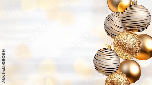 Fototapeta premium Gold And White Christmas Ornaments On Bokeh Background