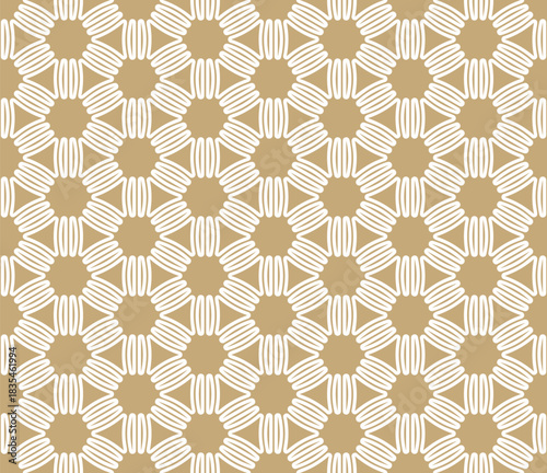 © Olgastocker, Fototapeta premium Gold and white vector seamless pattern. Abstract floral geometric texture. Elegant ornamental background with flower shapes, lines, triangles, grid, lattice. Golden repeating decorative design
