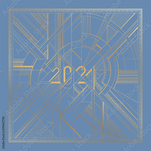Fototapeta premium Gold art deco 2021 new year frame on blue background