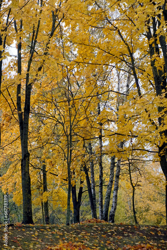 © Anatoliy, Fototapeta premium Gold autumn. October. Trees in the park in autumn attire. It's a nasty day.