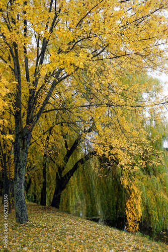 Fototapeta premium Gold autumn. October. Trees in the park in autumn attire. It's a nasty day.
