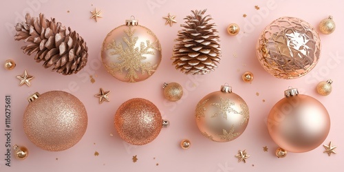 Fototapeta premium Gold baubles and snowflake on beige background