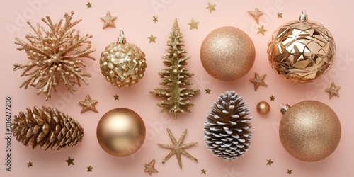 Fototapeta premium Gold baubles and snowflake on beige background