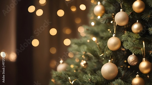 © Organicpatterns, Fototapeta premium Gold Baubles and Warm Glow on a Christmas Tree. golden Christmas lights.