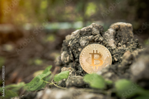 © Boxyray, Fototapeta premium gold bitcoin on dirty ground