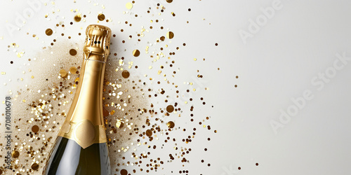 © Valeriia, Fototapeta premium Gold bottle with party shiny glitter streamers on white background. Horizontal banner for celebrations and invitation cards. Empty space place for text, copy paste