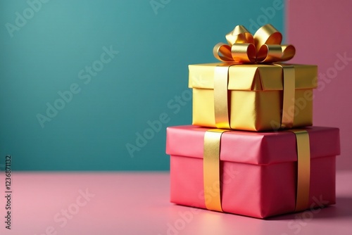 Obraz premium Gold bow-topped present on top of a multicolored stack, gold, presents,...
