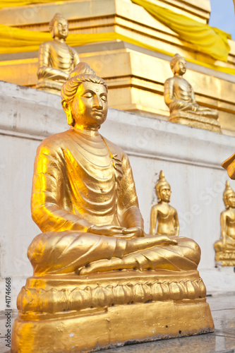 © Satawat Anukul, Fototapeta premium Gold buddha in front of gold pagoda
