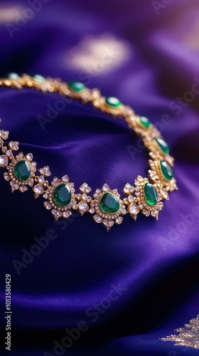 Fototapeta premium Gold choker necklace with emerald stones placed on a deep sapphire blue satin fabric, with a royal purple-to-sapphire gradient background and faint candlelight, Copy space, happy Diwali background