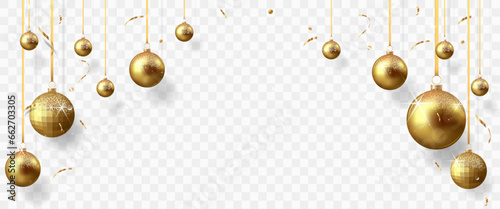 © Kalabukhava Iryna, Fototapeta premium Gold christmas balls with shadow and confetti isolated on transparent background