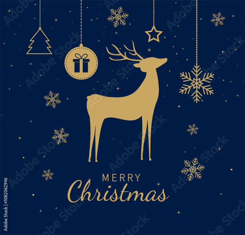 Fototapeta premium Gold Christmas baubles with reindeer, snowflake, christmas tree, candy cane, gingerbread man, gift box. Xmas decoration design. Merry christmas and New year card. Vector illustration