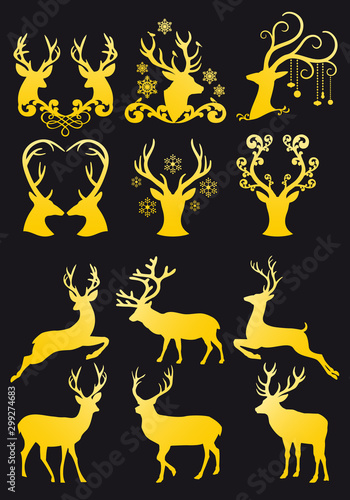 Fototapeta premium Gold Christmas deer heads, golden reindeer, vector set
