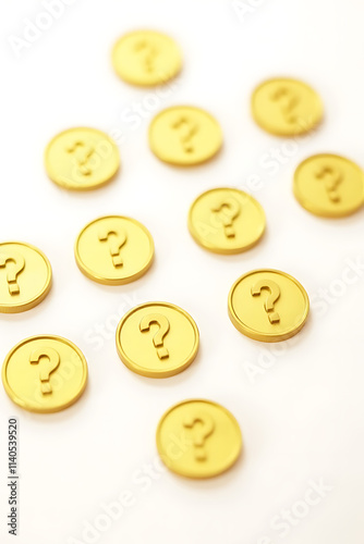Fototapeta premium Gold coins with question marks arranged in a pattern on a white background...