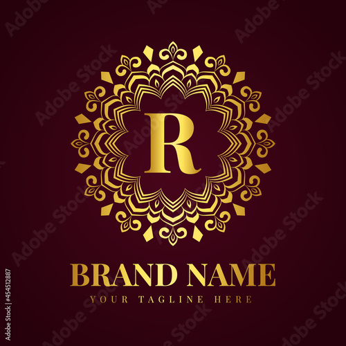 © mdhelalakbar, Naklejka premium Gold color luxury letter r brand logo design template