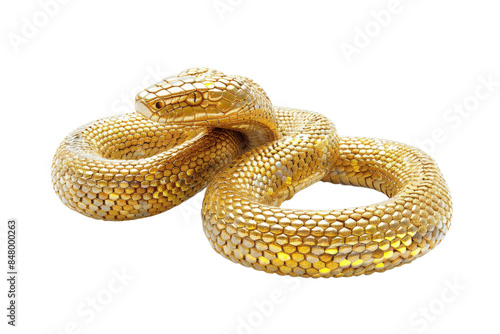 © peerasak, Obraz premium Gold Colored Snake Is Curled Up On A White Background, 3D Render, Illustrations, Isolated On A Transparent Background.