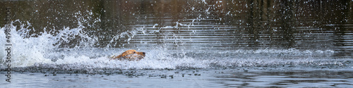 Obraz premium Gold dog, Labrador retriever, swimming after a ball in the Sammamish River