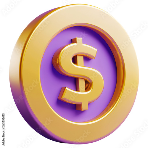 © Flowaiart, Obraz premium Gold Dollar Sign Coin on Purple Disc Rendering with Transparent Background