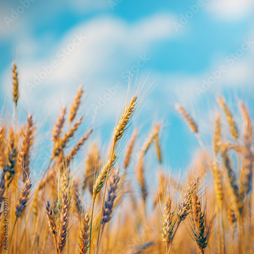 Fototapeta premium gold ears of wheat under blue sky. soft focus on field