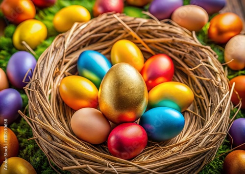 Naklejka premium Gold Egg in Nest Surrounded by Colorful Eggs Representing the Success of...