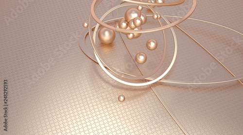© Татьяна Леднева, Obraz premium Gold figures on a gold background. Abstract composition of balls and rings. 3D illustration