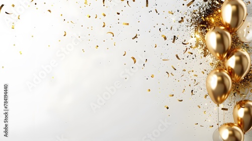 © horizon, Fototapeta premium Gold fireworks abstract background, with shiny falling confetti and balloon on a white background. Party and celebration space for copy on the left. For Festivals, holidays, Design, Background, Cover,