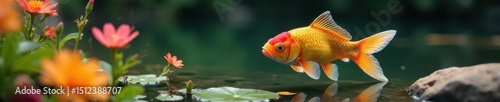 © retirementfun, Fototapeta premium Gold fish swimming in the pond amidst beautiful flowers, garden, water